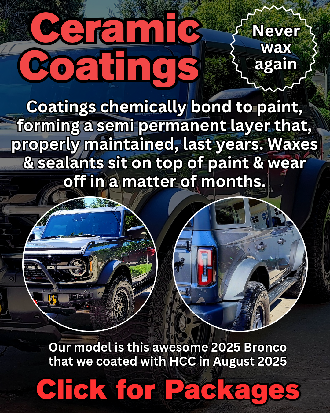 Ceramic coatings form a layer over your vehicle’s clear coat that protect it from UV rays, dirt, snow removal chemicals, and other harmful factors that not only make your paint look bad, but can cause paint failure, especially on new cars. Modern cars typically have half the clear coat thickness than cars even 10 years old.